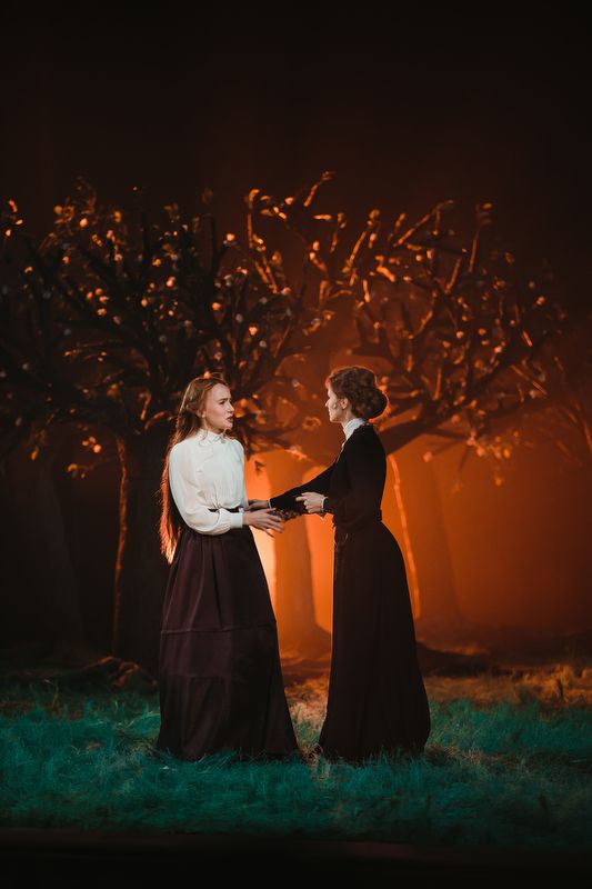 «Снился мне сад в подвенечном уборе» выводит на расстроенном клавесине то один персонаж, то другой. Для них сад — центр мироздания. Здесь происходят все главные события: приезды-отъезды, чаепития, ухаживания и объяснения. Владельцы дорожат им больше, чем домом, ставшим всего лишь символом невозвратного детства. Усиливая метафору, режиссер превращает старинную усадьбу в детскую игрушку. В кукольном домике, как в шкатулке, хранятся милые сердцу комодики, стульчики, кроватки. А солидный дядечка, вдохновенно взывающий к дорогому многоуважаемому шкафу, умещающемуся на ладони, вызывает в зале искренний, непритворный смех. Гаев у Александра Тютина не просто славный большой ребенок, каким его обычно показывают, а хитрый мальчишка, категорически отказывающийся взрослеть, чтобы не брать ответственность ни за свою жизнь, ни за судьбу близких, ни уж тем более имения.